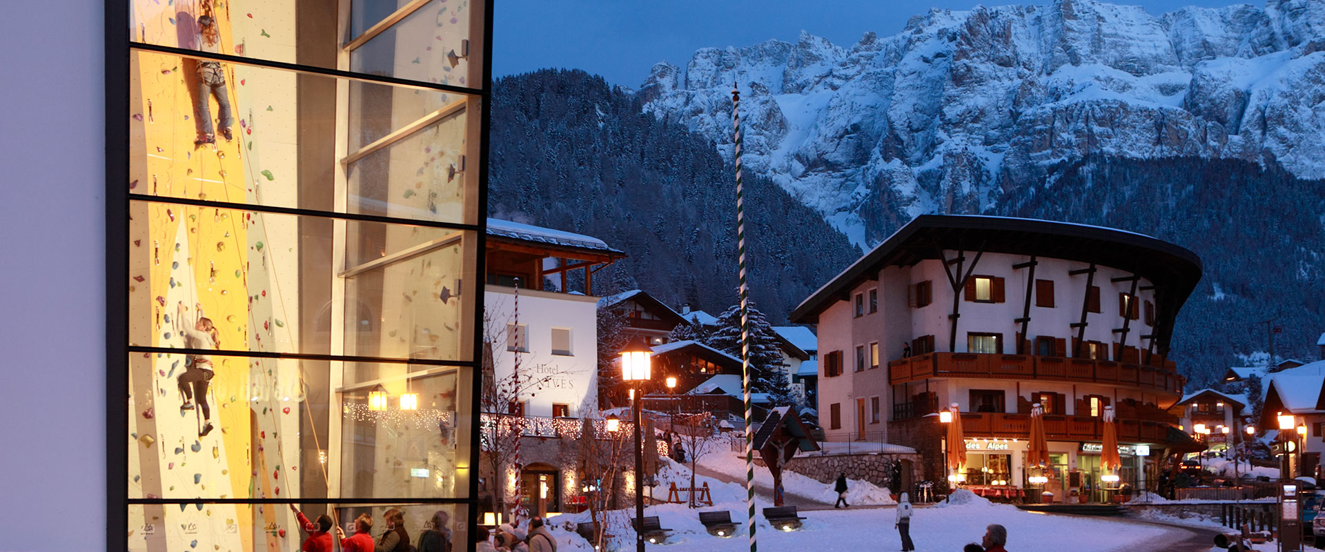 The climbing hall is located in the centre of Selva, at the Nives square.